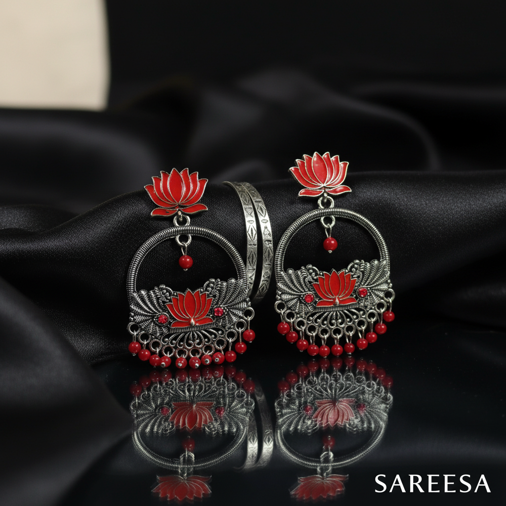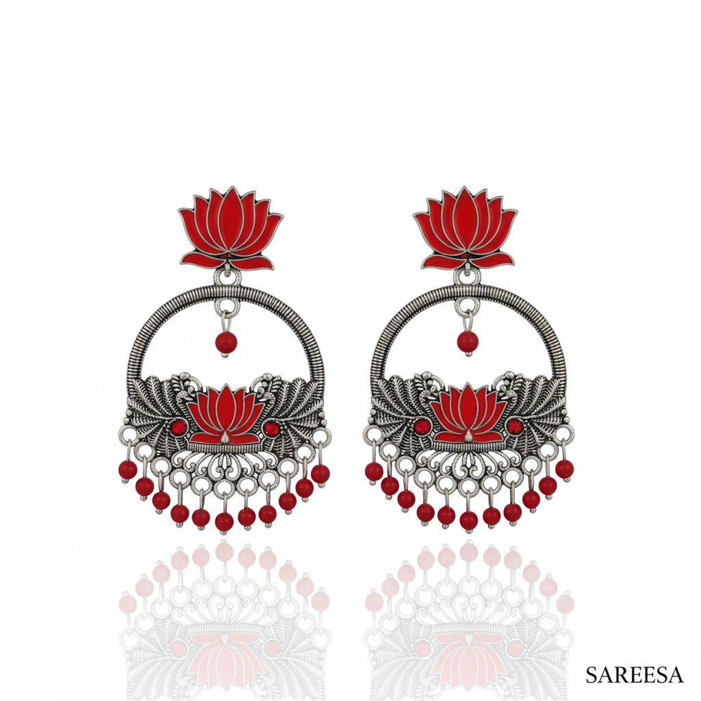 Elegant oxidised lotus earrings with red enamel detailing and bead hangings — perfect for festive wear, weddings, parties, and ethnic styling. Lightweight, bold, and beautifully crafted.