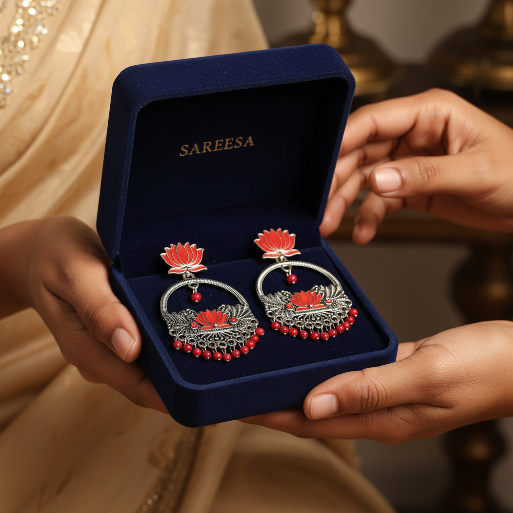 Make a stunning style statement with the Sareesa Red Lotus Royal Oxidised Earrings, beautifully crafted to blend elegance with bold traditional charm. Designed with a striking red lotus motif and intricate oxidised silver detailing, these earrings exude ethnic grace and artistic beauty. The circular chandbali-style frame is adorned with delicate bead hangings, adding movement and sophistication to every look. Perfect for festive occasions, wedding functions, parties, cultural events, and ethnic styling, these earrings pair effortlessly with sarees, lehengas, kurtis, and Indo-western outfits. Lightweight yet impactful, they are made to make you stand out with confidence and style.