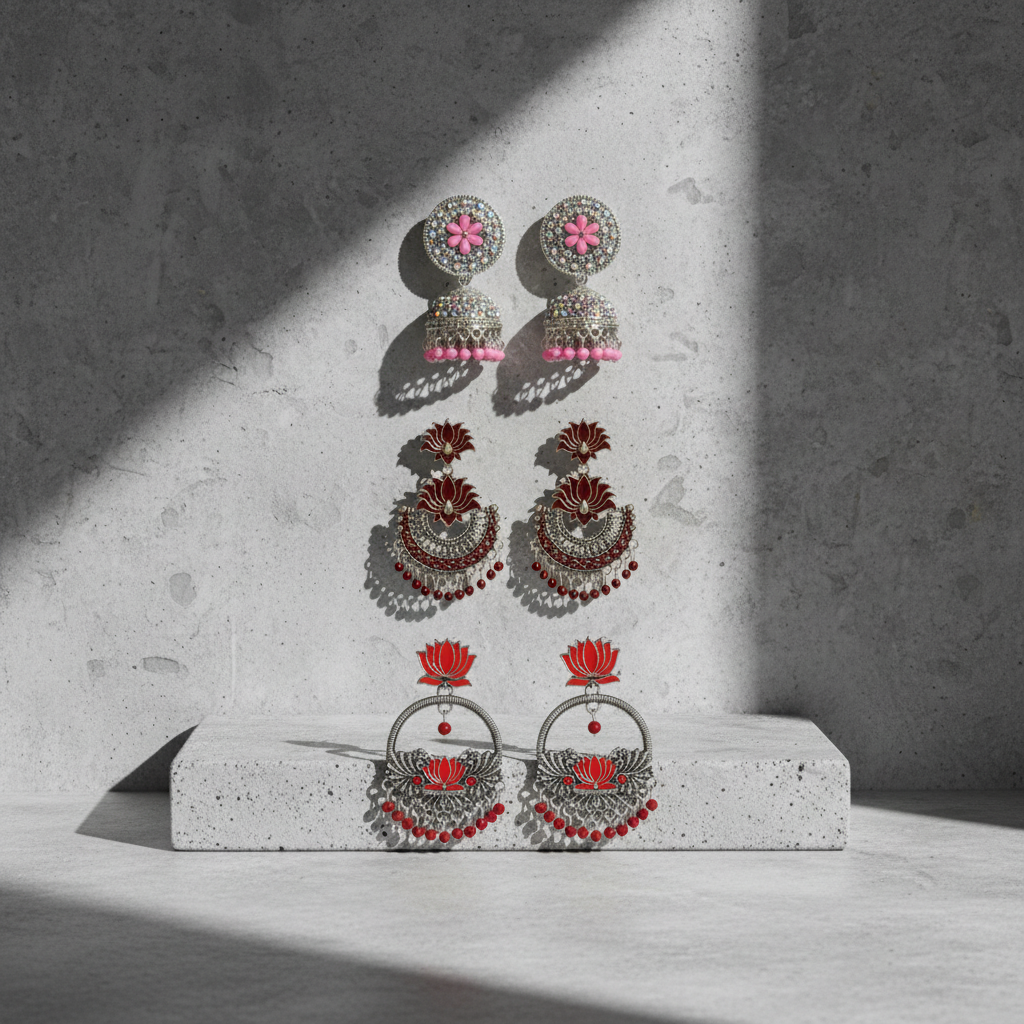 Immerse yourself in the opulent legacy of Sareesa with our Empress’s Bloom collection. This curated trio is a masterclass in artisanal craftsmanship, blending the rustic charm of oxidised silver-tone metal with the vibrant energy of hand-painted enamels. The collection features three distinct interpretations of the sacred lotus: from the delicate pink Jhumkas that dance with every movement, to the regal deep-maroon crescents that echo the mystery of twilight, and the bold crimson hoops that celebrate the sun-drenched vitality of a garden in peak bloom. Each piece is meticulously detailed with intricate filigree and finished with a cascade of dainty beads that provide a subtle, rhythmic melody as you move. These are not merely accessories; they are wearable heirlooms designed for the woman who carries her heritage with pride and her style with effortless grace. For a truly captivating look, pair the deep red lotuses with a charcoal silk saree to let the colors pop, or style the pink Jhumkas with an ivory anarkali for a romantic, ethereal aesthetic. Experience the tactile luxury of smooth enamel against textured metal, a sensory journey crafted exclusively by the house of Sareesa.