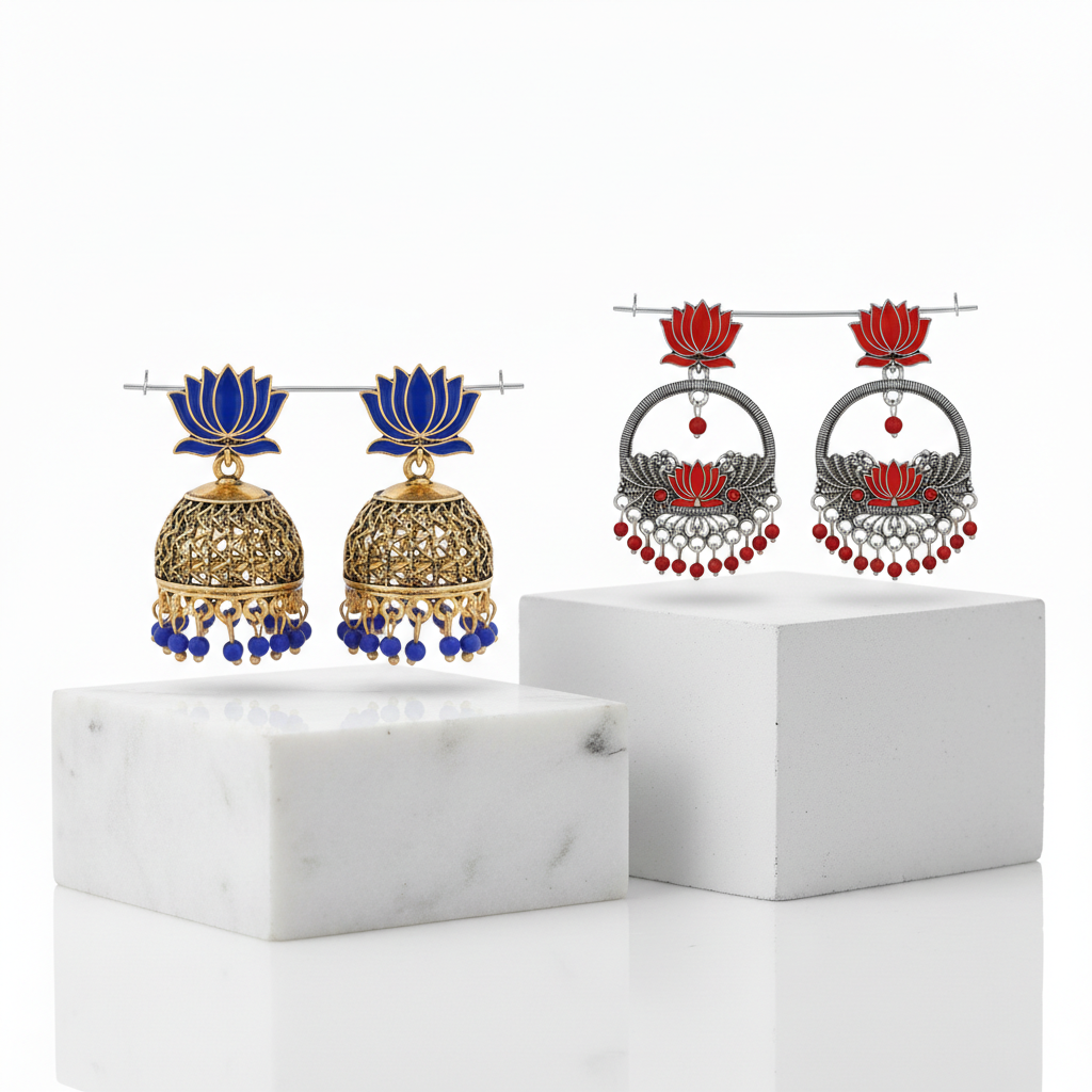 The Eternal Bloom: Regal Lotus Handcrafted Earring Collection (Multicolour Pack of 2)