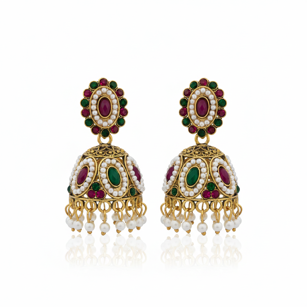 Embark on a journey of sartorial excellence with the Heritage Chronicles by Sareesa. This exquisite duo of Jhumkas is a testament to the enduring legacy of artisanal jewelry making. Each piece is meticulously forged to capture the essence of a bygone era while remaining perfectly poised for the modern landscape of luxury. The first ensemble features a charming heart-shaped stud in a matte antique gold finish, culminating in a rhythmic cascade of royal amethyst-toned beads. It is a piece designed for the understated romantic, offering a whisper of color and a wealth of character. In contrast, the second pair is a majestic display of festive splendor. Intricately set with deep ruby and emerald-inspired stones, it is framed by a delicate halo of ivory pearls that shimmer with a soft, ethereal light. The textured gold work mimics the patterns of ancient palace architecture, ensuring that you carry a piece of history with you. These earrings are more than mere accessories; they are artifacts of grace. Style them with a heavy Banarasi silk for a wedding or a minimalist linen tunic for an elevated dinner—Sareesa ensures you are always the center of the story.